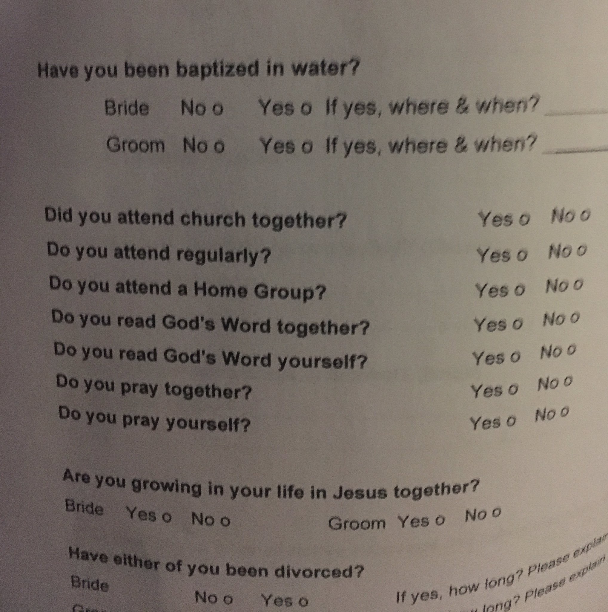 When you're trying to be a good Christian couple, you schedule a pre-marital class together but within the first 5 minutes you're invited to go through a 10 page contract asking questions that require honesty on another level. You find out the contract needs to be signed in order to proceed. "Have you ever taken drugs or alcohol? Are you co-habitating? Are you sexually involved?" Say yes and you won't be allowed in. #nervous